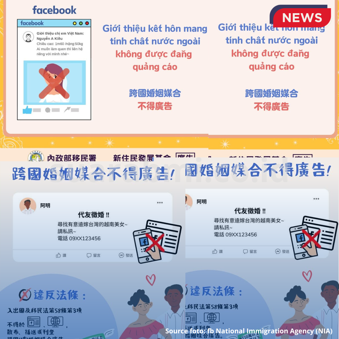 Suarabmi.co.id — Direktorat Jenderal Imigrasi Taiwan (National Immigration Agency / NIA) kembali mengeluarkan peringatan kepada masyarakat terkait larangan pemasangan iklan perjodohan atau perantara pernikahan lintas negara secara terbuka, khususnya di media sosial.