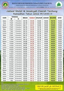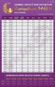 Berikut ini jadwal imaskiyah khusus di Taiwan, bagi sahabat PMI di Taiwan dapat memanfaatkan jadwal ini untuk untuk menentukan waktu sahur dan buka puasa.