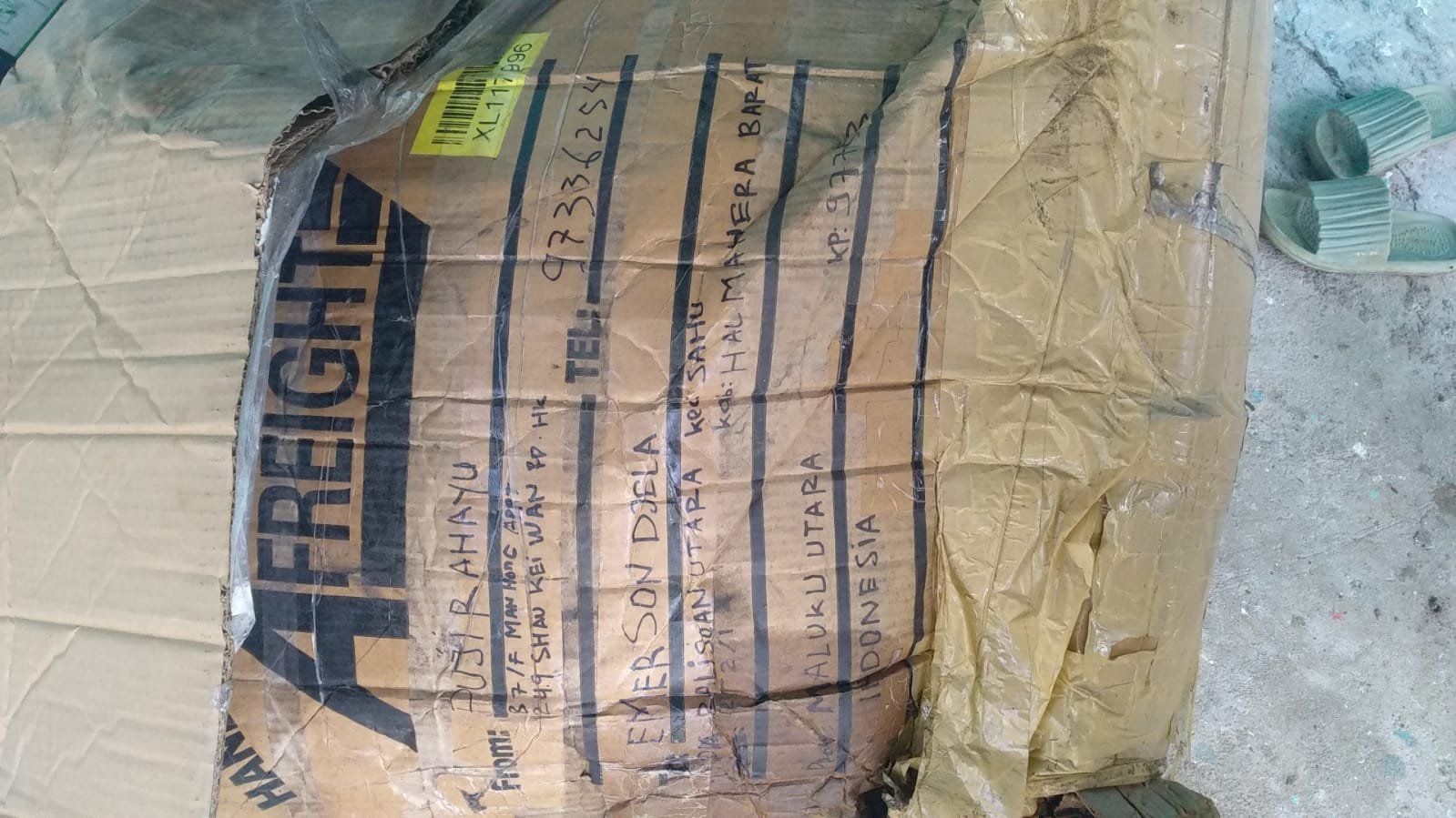 Kardus paket tersebut tertuliskan pengirim bernama Puji Rahayu yang bekerja di Shaw Kei wan rd Hong kong, dengan alamat tujuan Maluku Utara.