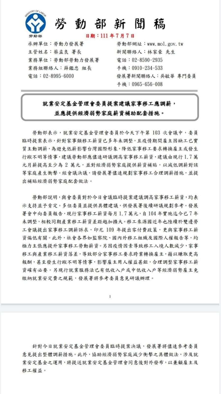 Setelah resolusi pertemuan tersebut, Badan Pembangunan diminta untuk merencanakan sesegera mungkin langkah-langkah penyesuaian gaji yang wajar bagi pekerja migran rumah tangga, dan untuk mengusulkan langkah-langkah pendukung untuk mensubsidi keluarga yang kurang mampu secara ekonomi.